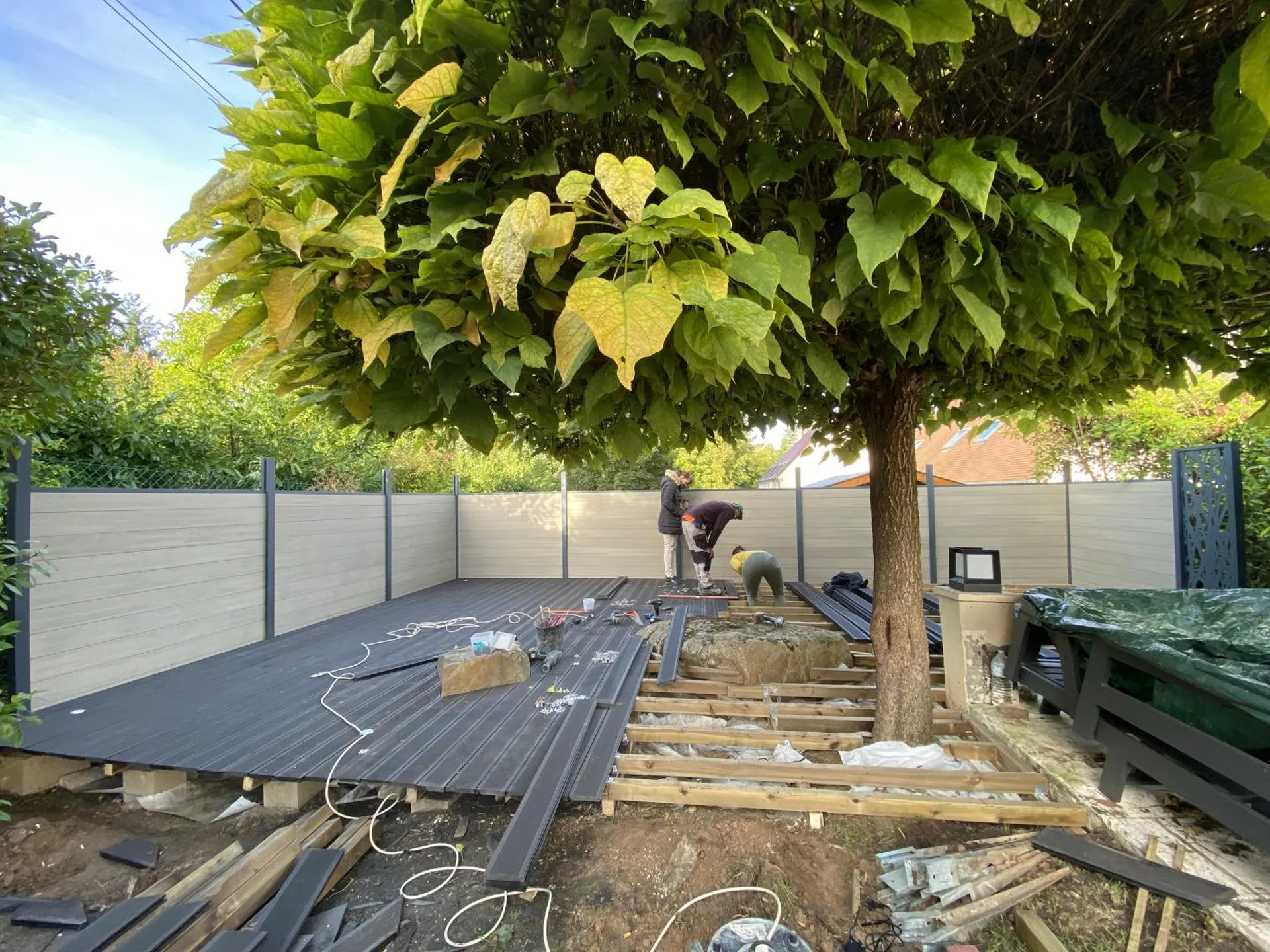 À Samoreau, proche de Fontainebleau et Avon, DM Paysages a réalisé un projet d’aménagement extérieur sur-mesure avec la création d’une terrasse en composite et la pose de claustra pour structurer et préserver l’intimité des lieux.